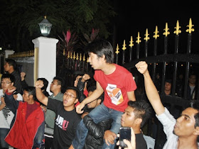 Hari ini selepas sahaja dibebaskan oleh pihak polis dari Balai Slim River, kumpulan pelajar yang diketuai Adam Adli bertindak berhimpun sekali lagi di hadapan UPSI tengah hari tadi. Anehnya ketika perhimpunan tengah hari tadi kelihatan beberapa pemimpin PAS bersama dengan kumpulan 'mahasewel' ini antaranya adalah Ahli Parlimen PAS Pokok Sena Mahfuz Omar atau nama sebenarnya Mahfuz 'Bean' Omar. (gambar atas)